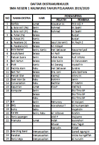 SMA Negeri 1 Kaliwungu Kabupaten Kendal sebagai bagian dari lembaga pendidikan yang berada di wilayah NKRI tentu berusaha sekuat tenaga untuk mewujudkan tujuan pendidikan yang telah diamanatkan oleh pemerintah. Salah satu program kesiswaan dalam upaya ini adalah meningkatkan kemampuan siswa terkait dengan bakat minat yang dimiliki siswa dengan menyediakan berbagai kegiatan ekstrakurikuler yang sesuai dengan kemampuan sekolah. Berikut ini daftar ekstrakurikuler beserta jadwal dan para pelatih yang berada di SMA Negeri 1 Kaliwungu.